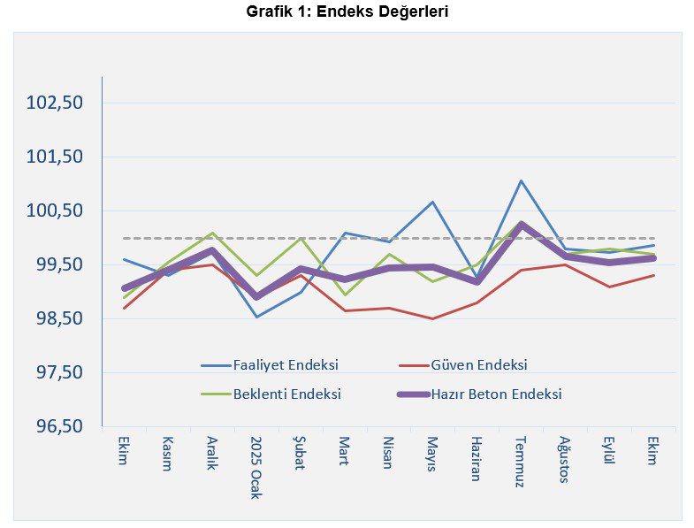 Hazır Beton Endeksi 2025 Ekim Ayı Raporu’na göre, tüm endeksler ağustos ayından itibaren son 3 aydır eşik değerin altında yatay bir hareket sergilemektedir. Ekim ayında endeks değerleri, eylül ayına oldukça yakın seyretmiştir. Güven Endeksi hafif bir toparlanma sergilemiş olsa da değer olarak en düşük endeks durumundadır. Faaliyet Endeksi sınırlı bir yükseliş, Beklenti Endeksi ise sınırlı bir azalış göstermiştir. Son olarak Birleşik Beton Endeksi negatif tarafta kalarak bir önceki aya paralel bir hareket sergilemiştir.